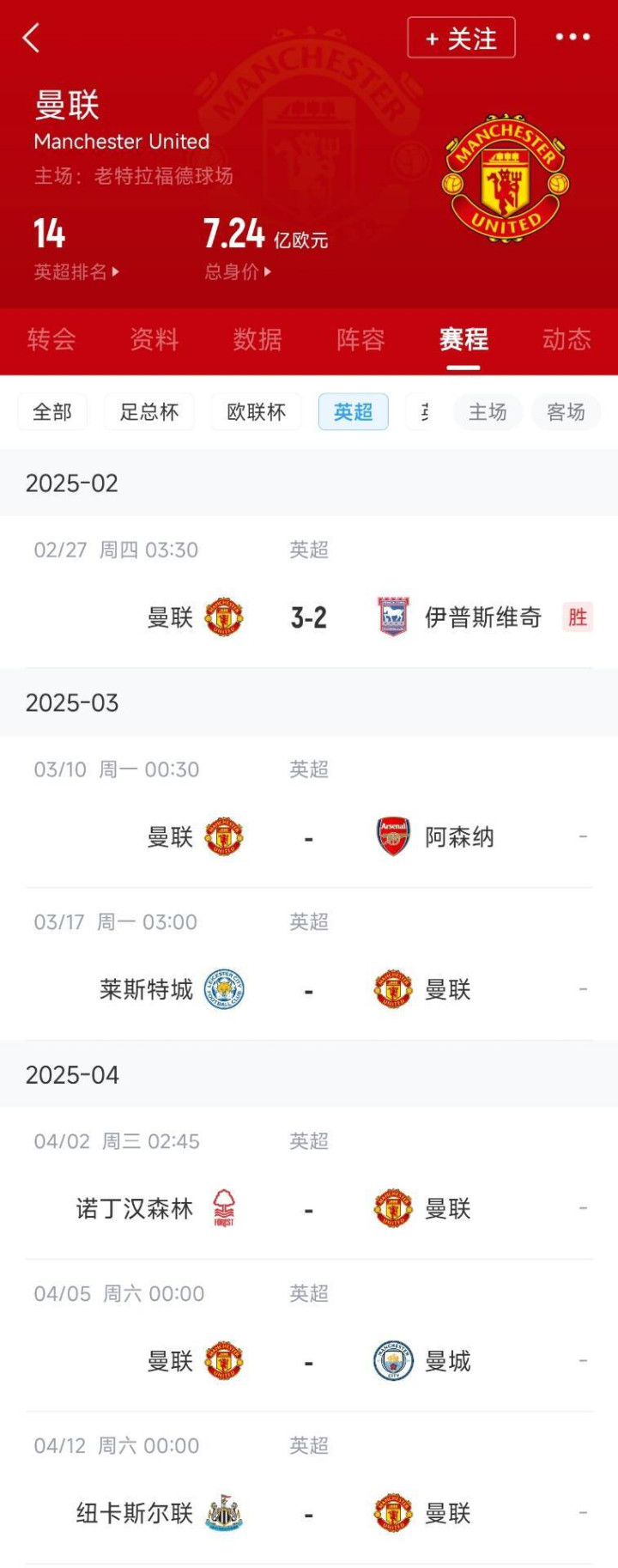 蓝狐救一下? 曼联未来5轮将遭遇英超2/3/4/6名: 枪手森林曼城纽卡
